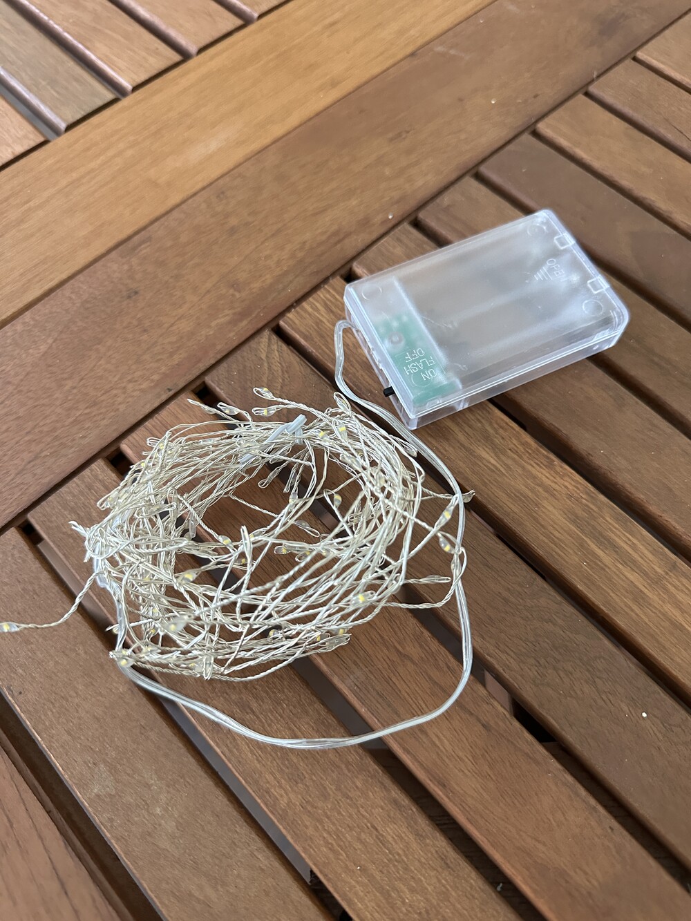 조명컬러 웜화이트컬러의 건전지타입 와이어지네전구 입니다.