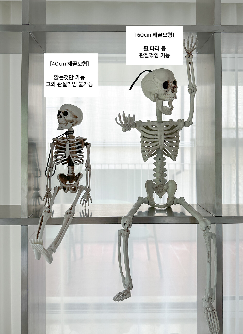 60cm 미니해골전신은 40cm 해골모형과는 다르게 팔, 다리 관절 꺾임이 가능합니다.