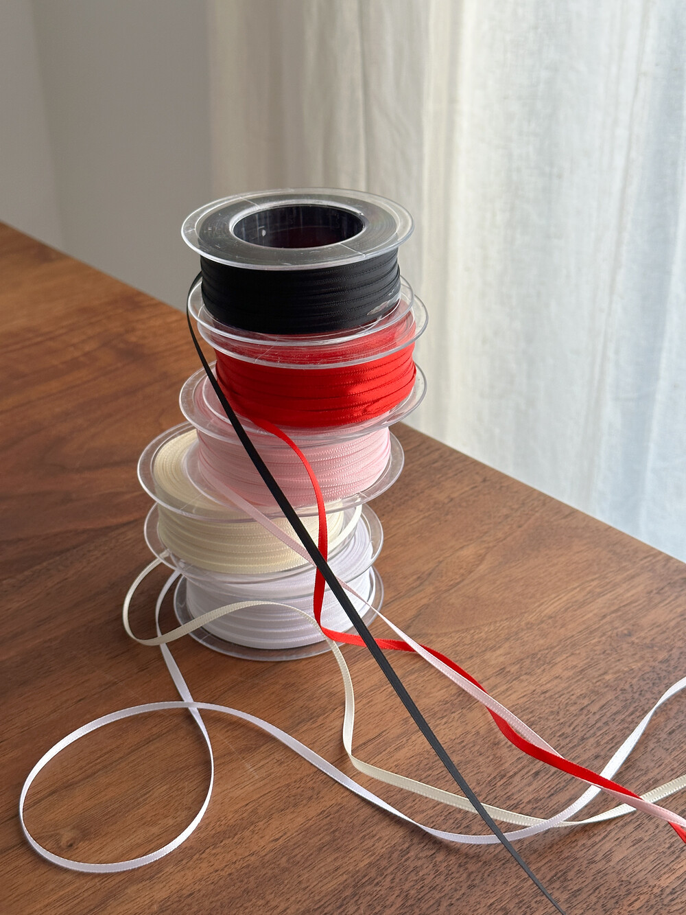 너비 3mm / 총 길이 약 50m의 얇은 공단 리본입니다.